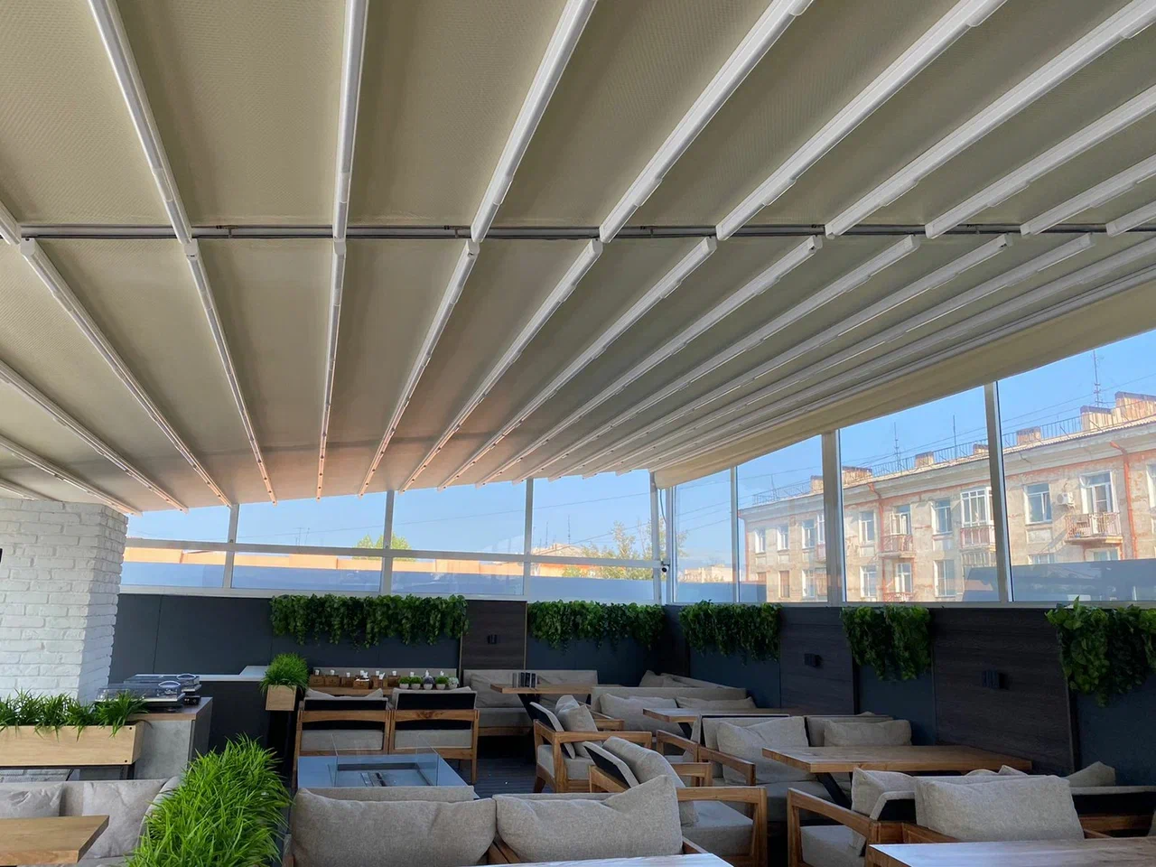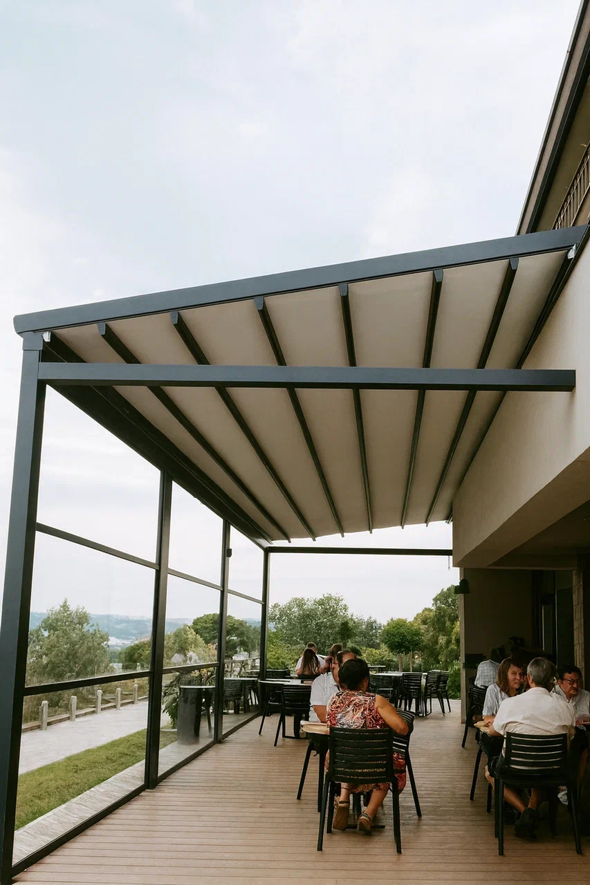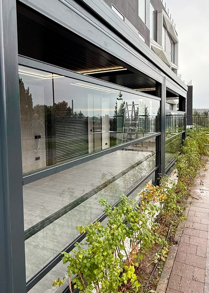 Слайдинговое остекление создаёт ощущение открытого пространства, сохраняя при этом комфорт и функциональность. Для бизнеса это решение позволяет использовать террасы в течение всего сезона и улучшить внешний вид объекта.