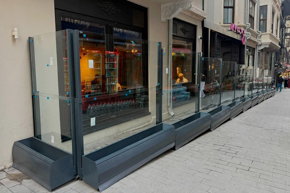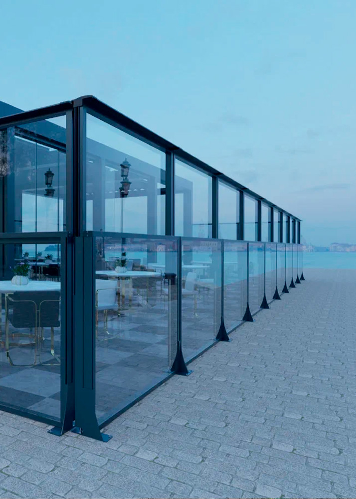Wind Breaker Glass — это система из прозрачных стеклянных панелей, которые устанавливаются вертикально и действуют как стенка‑ветрозащитник.