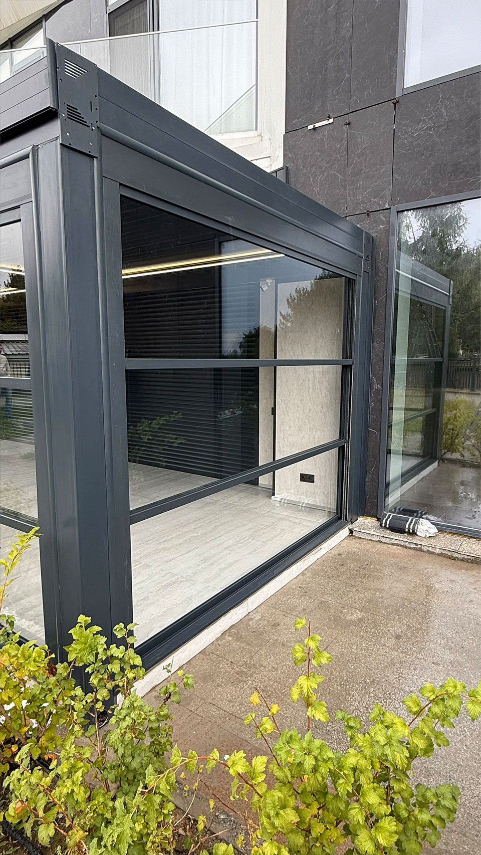 Гильотинное остекление — это вертикальная раздвижная система, где стеклянные створки движутся по направляющим вверх и вниз. Нижняя панель может фиксироваться в любом положении и часто используется как стеклянное ограждение.