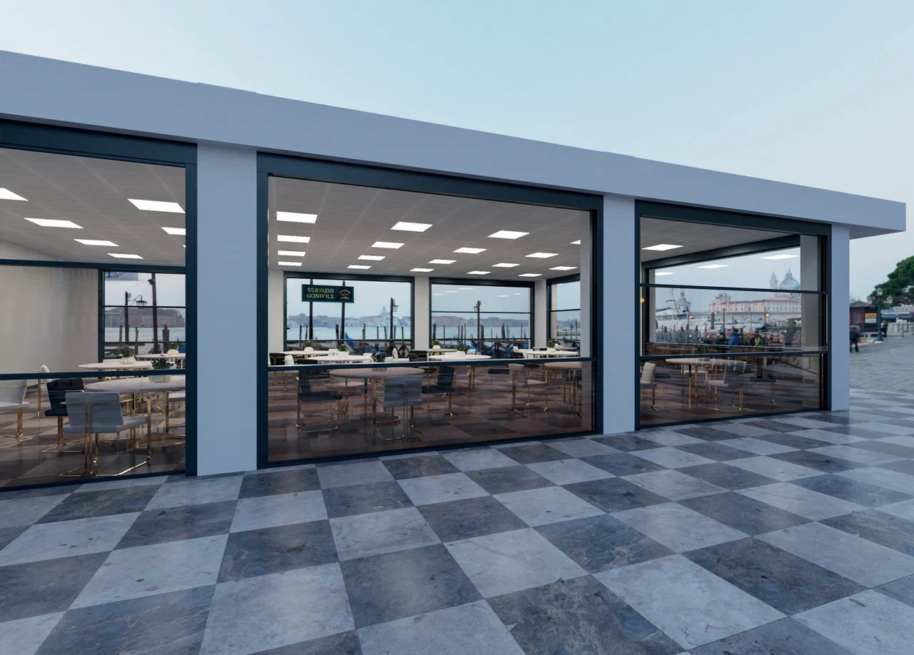 Гильотинная система состоит из нескольких стеклянных секций, которые поднимаются и опускаются вертикально по направляющим. В закрытом положении стекло защищает от ветра и осадков, в открытом — освобождает пространство.